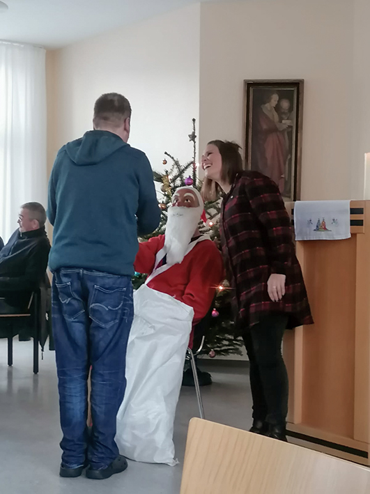 Pünktlich um 15:00Uhr bekamen wir Besuch vom Weihnachtsmann, der für jeden Bewohner eine kleine Weihnachtsüberraschung vom Haus Jona e.V. mitgebracht hatte. Wir sahen strahlende Gesichter, entdeckten verborgenen Talente und hatten jede Menge Spaß. Ein Großteil konnte sogar ein Gedicht oder ein kleines Weihnachtsgedicht vortragen, bei dem kein Auge trocken blieb. Jeder Bewohner konnte nach eigenem Ermessen sein Talent zeigen und alle wurden mit einem kräftigen Applaus und einem Geschenk belohnt. Vielen Dank an den Weihnachtsmann, der zusätzlich für jeden einen kleinen Schornsteinfeger als Glücksbringer für das neue Jahr übergab.